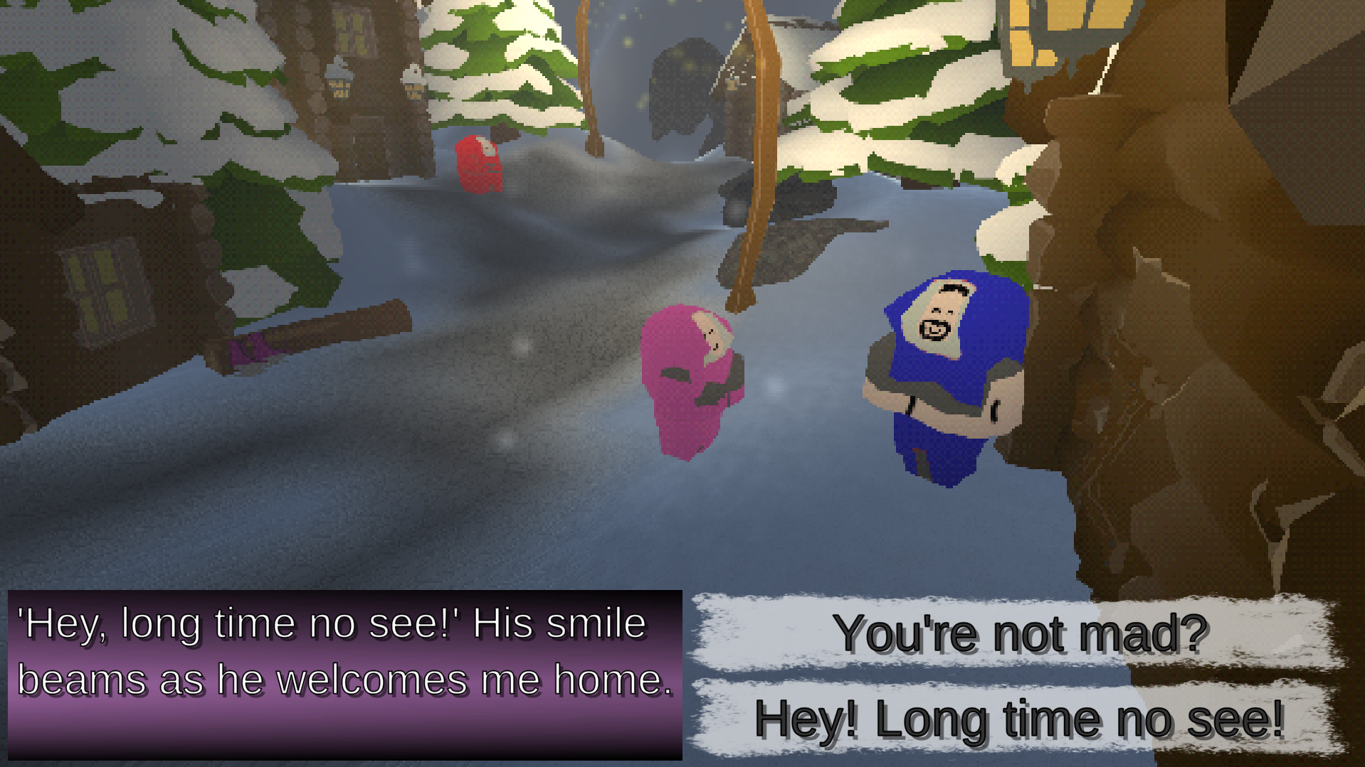 Explore around to find little interactions that give you more of the story, explore all dialogue options, and when you're ready head on down to the lake for some ice-skating!